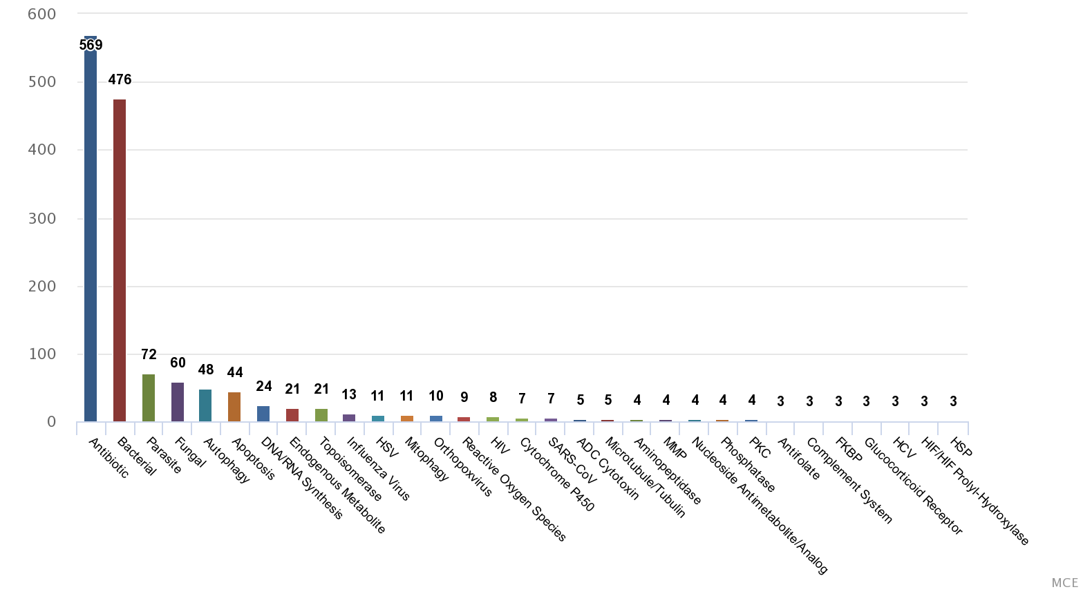 MCE supplies a unique collection of 569 antibiotics, including penicillins, cephalosporins, tetracyclines, macrolides, etc. MCE Antibiotics Library is a useful tool for anti-bacterial or anti-cancer drugs discovery.