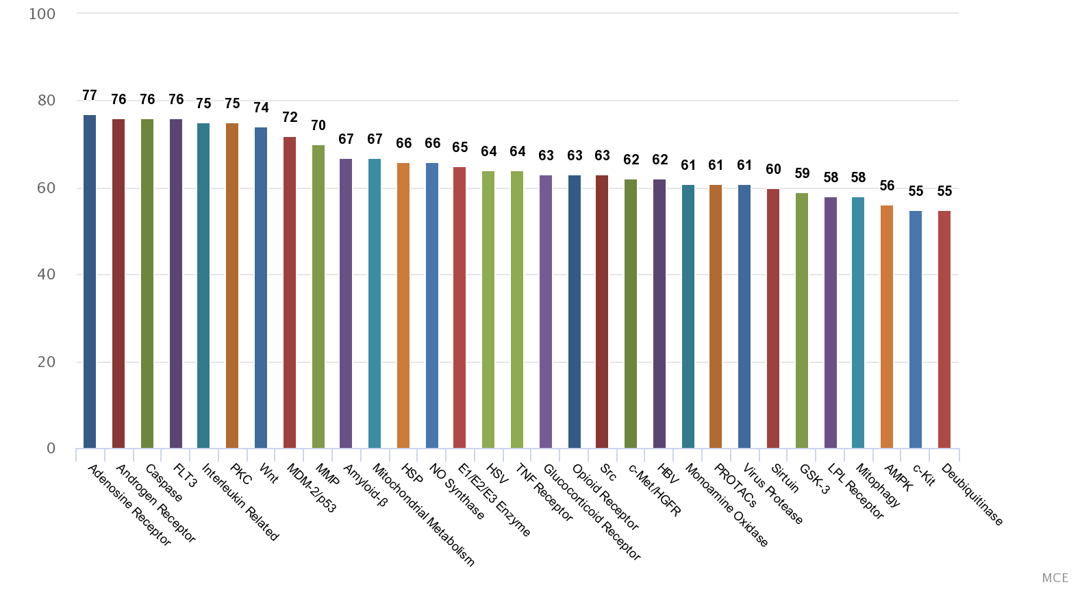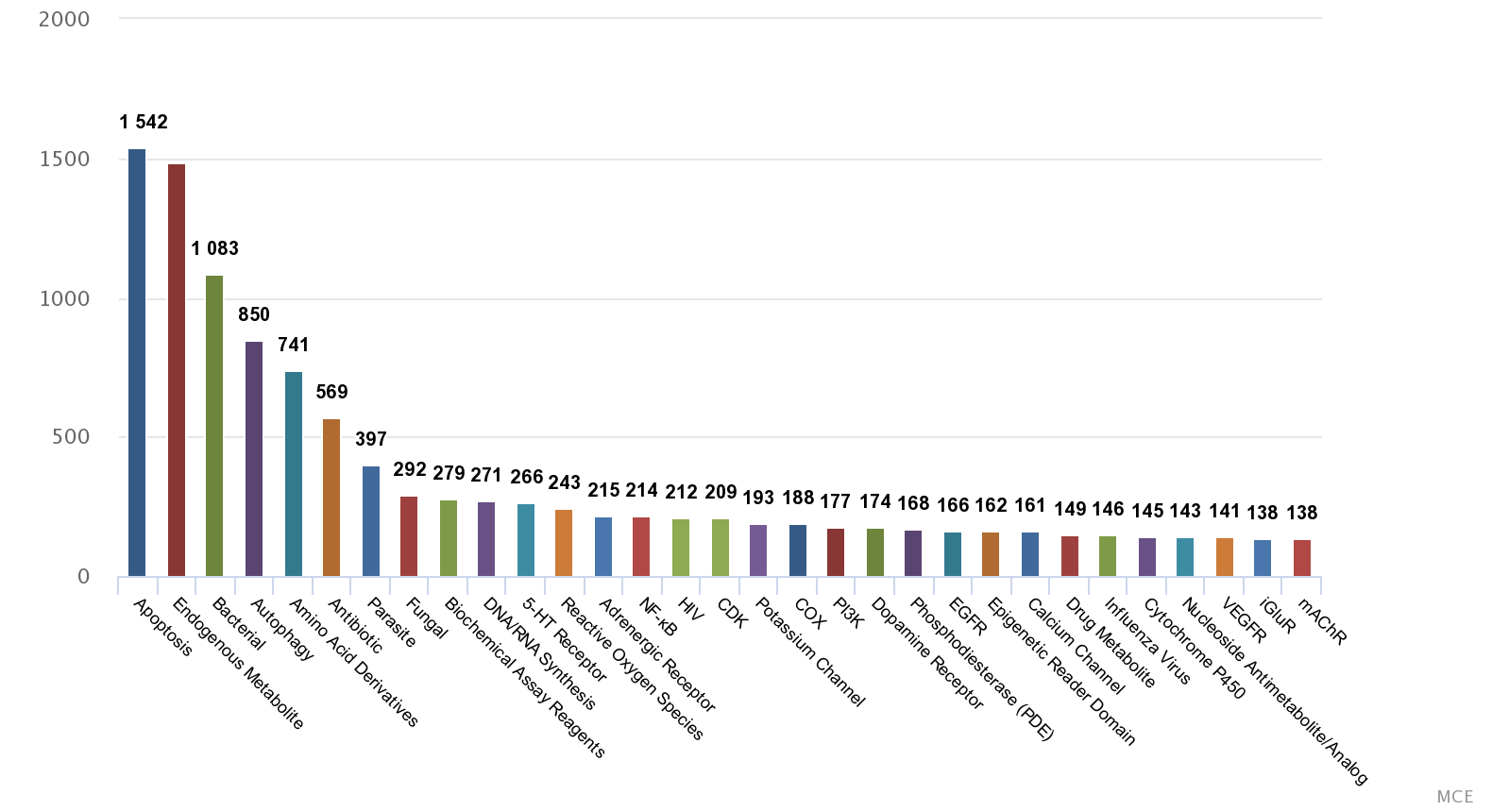 MCE owns a unique collection of 17164 compounds with confirmed biological activities and clear targets. These compounds include natural products, innovative compounds, approved compounds, and clinical compounds. These can also be used for signal pathway research, drug discovery and drug repurposing, etc. MCE Bioactive Compound Library can be supplied as pre-dissolved Solutions or Solid. For pre-dissolved solutions in this library, there are 16759 compounds supplied in 10 mM solution, 328 compounds supplied in 2 mM solution and 77 compounds supplied in 3 mg/mL solution.